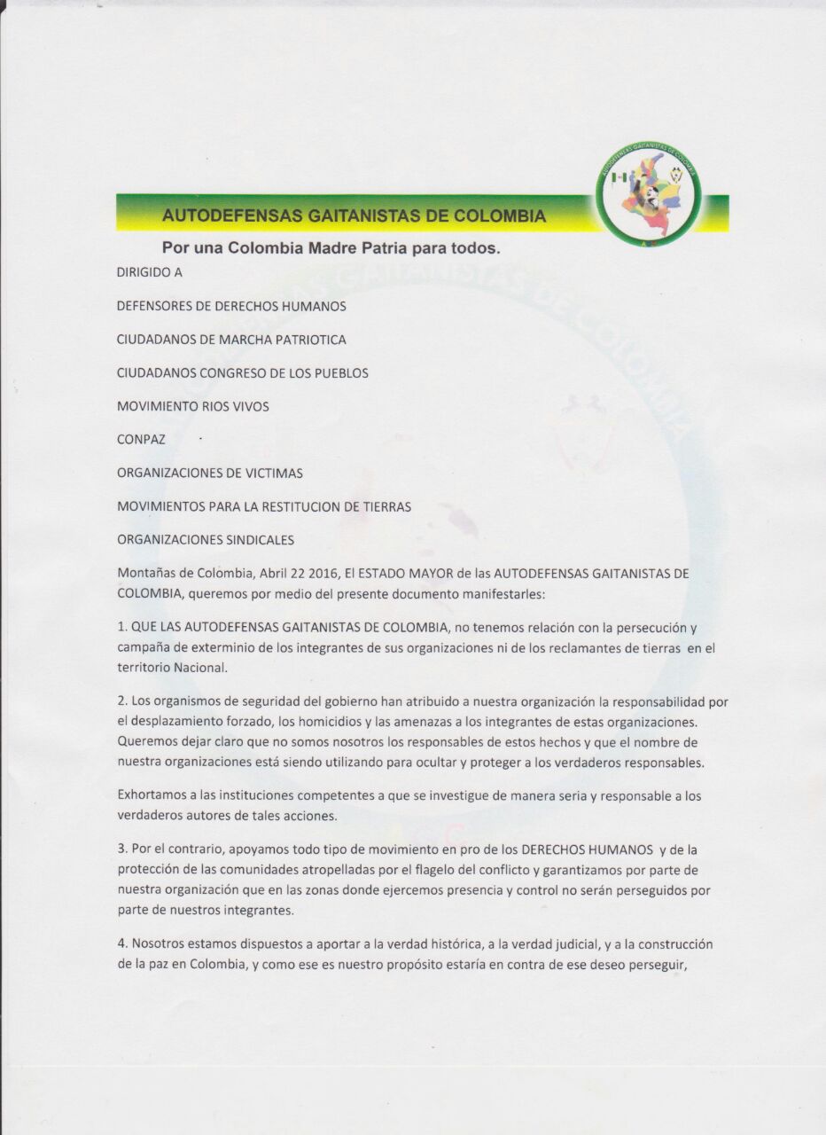 3. Amenazas por parte del grupo ilegal conocido como “urabeños” o “Gaitanistas”