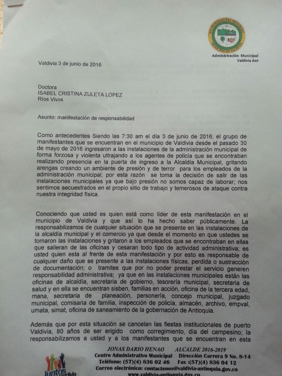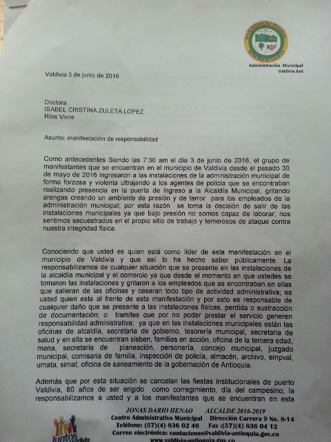En diferentes momentos en alcalde de Valdivia Jonas Henao a manifestado de manera genérica que “los mineros” lo han amenazado por esa carta que firmó en favor de Hidroituango. Así mismo se hecho gerencia al Movimiento Ríos Vivos en términos despectivos en espacios públicos, como “sospechosos” “no saben lo que quieren” sin embargo no se conoce una denuncia en especial y todos los mineros integrantes del Movimiento que se declararon abiertamente opositores a Hidroituango temen un montaje judicial pero sobre todo el desprestigio al que se han dedicado tanto el alcalde como el personero municipal. El personero de Valdivia Didier Garcia Alvarez durante la manifestación fue quien más dificulto el acercamiento entre los manifestantes y la institucionalidad, en momentos críticos cuando la Defensora del Pueblo intentaba mediar entre el alcalde y los manifestantes el personero provocaba con palabras mal intencionadas y gritos de esto fue testigo el representante a la camama Víctor Correa, quien presidio una reunión de acercamiento en la que se avanzaba pero que de no haber sido por el personero Didier Garcia Álvarez la movilización se habría levantado mucho más rápidamente que el mismo paro nacional. En múltiples ocasiones durante la movilización gritó a los manifestantes, diciendo que era el colmo que le hicieran eso al alcalde, intenta desprestigiar de manera permanente a Isabel Cristina Zuleta al afirmar que se gana más de 15millones por estar en el Movimiento, que es agresiva, además de repetir en distintos espacios que conoce a su familia en Ituango, a esta lidere intento amedrentarla en su despacho con insinuaciones como “de haber estado yo no le había permitido que humillara así al alcalde en ese debate, yo no le permito […] usted no pude en hacer […]” “yo la responsabilizó a usted de lo que pase” , también ha insistido en que los que estan en el Movimientos son caballos cocheros, que el amparo policivo él mismo se lo proyectó al alcalde y que hay que defender a la empresa. La lidere de la asociación de víctimas de Valdivia Blanca Inés Perez presentó su testimonio de manera pública sobre la manera como la alcaldía y personería le ha negado asuntos esenciales para la labor que realiza por el hecho de no haber apoyado al actual alcalde durante su campaña. Después de esto se le ha vuelto la vida imposible porque el personero Didier Garcia Álvarez ha dañado la imagen de la líder de quien indica a las demás vitrinas que no es alguien en quien puedan confiar, del mismo modo ha sido perseguida por otros integrantes de la administración con gestos desobligantes y malas palabras en rechazo a la denuncia realizada en público. .