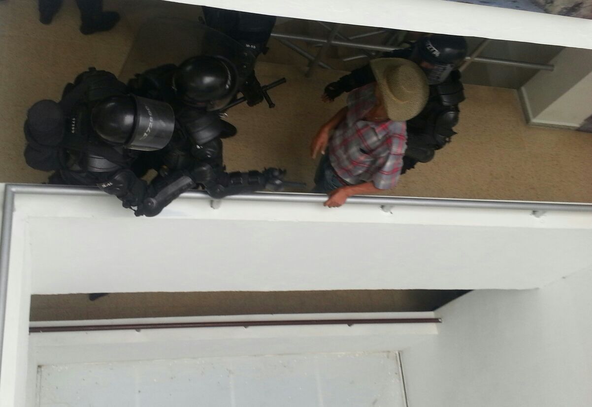 A las 2:00 p.m. entra el ESMAD tumbando la puerta principal de la alcaldía de Valdivia, empujando, acorralando y agrediendo a los manifestantes a pesar de que estos ya habían acordado salir de manera pacifica, después de la llegada del personero quien dejó su celular porque aseguró que volvería pronto, cuando llegó ya el ESMAD había ingresado de manera violenta, casi no se le permitió ingresar a la parte alta. No obstante, la salida fue tranquila y no hubo mayores contratiempos, muchos solicitaron ser requisados por la policia a las afueras y no obtuvieron respuesta. Los manifestantes almorzaron en las afueras de la alcaldía inmediatamente después de la salida, además realizaron un baile y tropas hasta entrada la noche, ninguno se retiro del lugar. En la fotografía logra verse a uno de los manifestantes acorralado y aún así preguntando que hacer lo que demuestra la actitud controlada y pacifista de los integrantes del Movimiento.