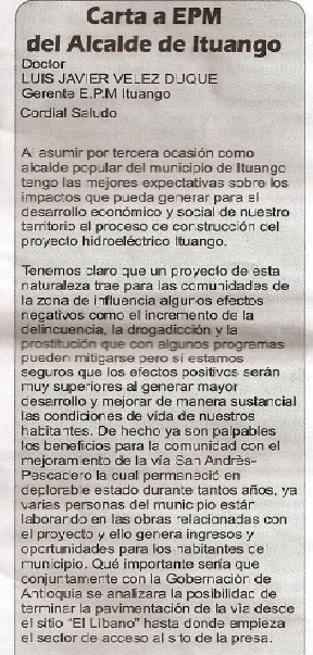 En la misma edición del Heraldo del Norte N°87, que lamentablemente no se encuentra en la web, y que por eso este blog considera como fundamental difundir en algunos de sus apartados, se publica una carta enviada por el alcalde de Ituango a la empresa EPM Ituango, en la que claramente se observa una respetuosa solicitud que de fondo tiene un incumplimiento de la Ley, de esta manera vemos como los alcaldes, prefieren establecer una relación de sumisión con los que ejecutan el proyecto, asumiendo que esta posición traerá beneficios económicos a los municipios, aún cuando esto implique tener una posición pasiva con relación a la exigencia del cumplimiento de la normatividad vigente. Resulta paradojico que a las personas humildes de estos municipios se les impida la construcción de cualquier obra por el no pago de altas suman correspondientes al impuesto a la construcción, al impuesto predial, de industria y comercio, los planos, entre otros muchos tramites exigidos a los pobladores y no así a foráneos, y más aún cuando son grandes empresas con grandes proyectos que manejan grandes sumas de dinero y cuyas obras están impactando en diversas formas a las comunidades.